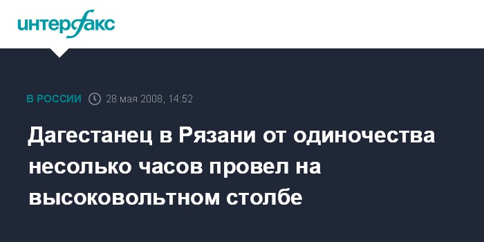 Москва. 28 мая. INTERFAX.RU – В Рязани приезжий из Дагестана несколько часов просидел на высоковольтном столбе, требуя телефон и журналистов.