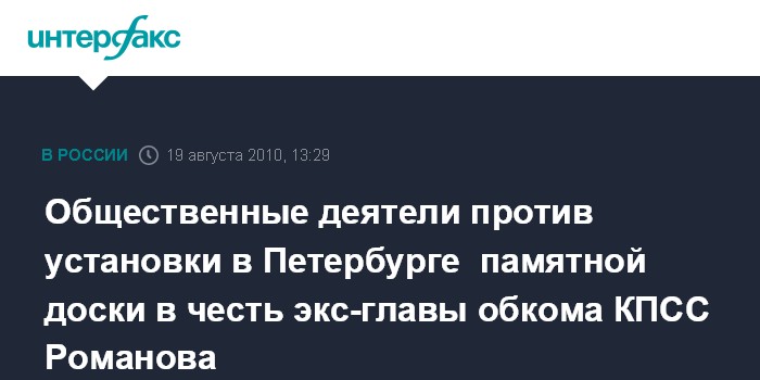 Москва. 19 августа. INTERFAX.RU - Известные общественные деятели призывают власти Санкт-Петербурга пересмотреть решение об установке в городе памятной доски в честь бывшего первого секретаря обкома компартии Григория Романова.