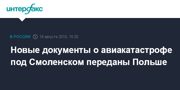 Москва. 19 августа. INTERFAX.RU - Россия передала Польше новые материалы, касающиеся расследования катастрофы в апреле под Смоленском самолета президента Польши Леха Качиньского.