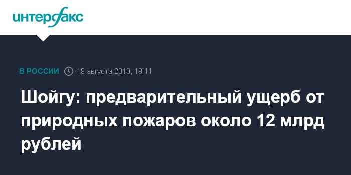 Москва. 19 августа. INTERFAX.RU - Общий ущерб, причиненный российским регионам природными пожарами летом 2010 года, может достигать 12 млрд рублей, сообщил глава МЧС России Сергей Шойгу.