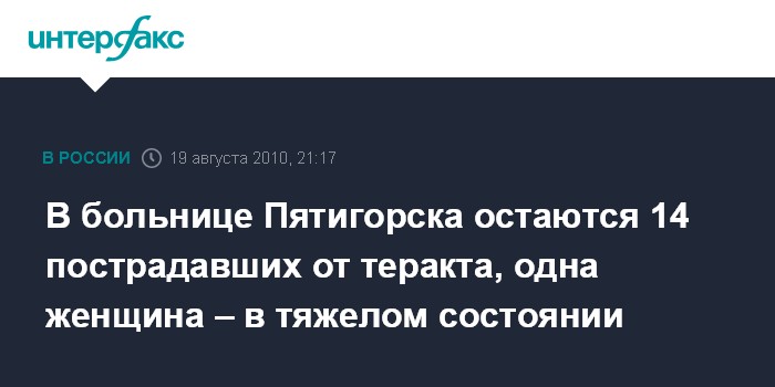 Москва. 19 августа. INTERFAX.RU - Из 33 пострадавших в результате взрыва в Пятигорске 17 августа в Центральной городской больнице продолжают лечение 14 человек, из них один пациент - в тяжелом состоянии.