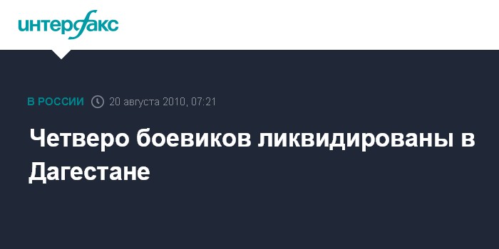 Ростов-на-Дону. 20 августа. ИНТЕРФАКС-ЮГ - Четверо боевиков уничтожены в ходе спецоперации, проведенной в Хасавюртовском районе Дагестана, сообщили агентству "Интерфакс-Юг" в штабе объединенной группировки войск на Северном Кавказе.
