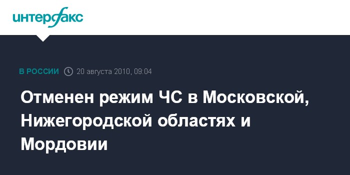 Москва. 20 августа. INTERFAX.RU - Президент РФ Дмитрий Медведев на основании доклада главы МЧС Сергея Шойгу о ситуации с пожарами отменил режим чрезвычайной ситуации в Московской, Нижегородской областях и Мордовии.