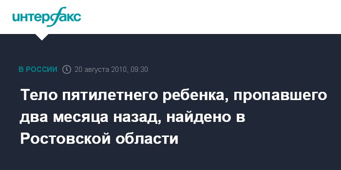 Москва. 20 августа. INTERFAX.RU - В городе Шахты Ростовской области обнаружено тело пятилетнего Николая Завороткова, пропавшего в июне текущего года.