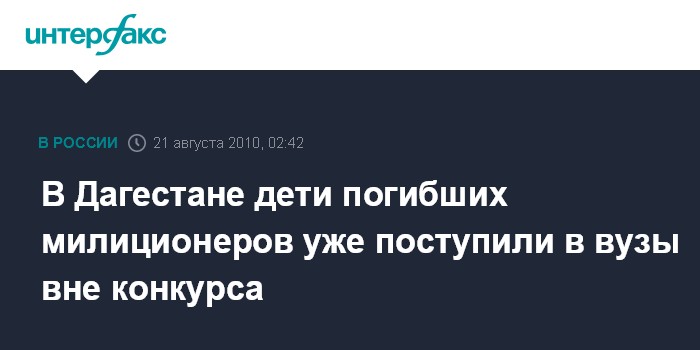 Пятигорск. 21 августа. ИНТЕРФАКС-ЮГ - В Дагестане с этого учебного года дети погибших сотрудников милиции поступают в вузы на внеконкурсной основе, сообщил президент Дагестана Магомедсалам Магомедов.