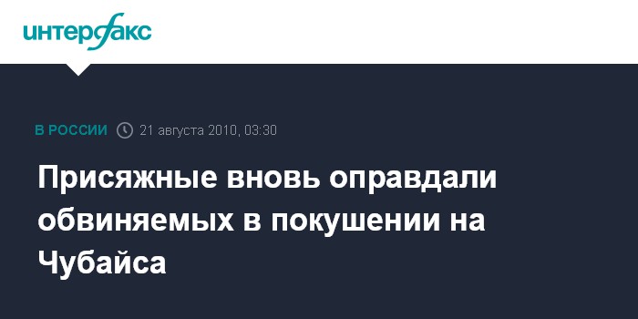Москва. 21 апреля. ИНТЕРФАКС - Присяжные Мособлсуда во второй раз оправдали обвиняемых по факту покушения на экс-главу РАО "ЕЭС России" Анатолия Чубайса, совершенном в 2005 году в Подмосковье.