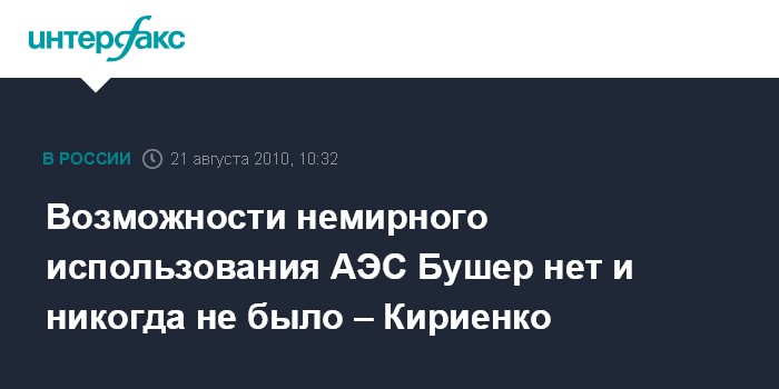 Бушер (Иран). 21 августа. INTERFAX.RU - Никакой возможности использования иранской АЭС Бушер в немирных целых не существует, считает глава Росатома Сергей Кириенко. "Ни у кого из профессионалов в мире не существует никаких вопросов по возможности немирного использования АЭС в Бушере. Абсолютно понятно, что такой возможности никогда не было, ее нет", - заявил С.Кириенко в субботу журналистам в ходе мероприятий, посвященных физическому пуску первой иранской атомной станции. Глава Росатома отметил, что АЭС Бушер никогда не подпадала ни под какие ограничения и санкции.