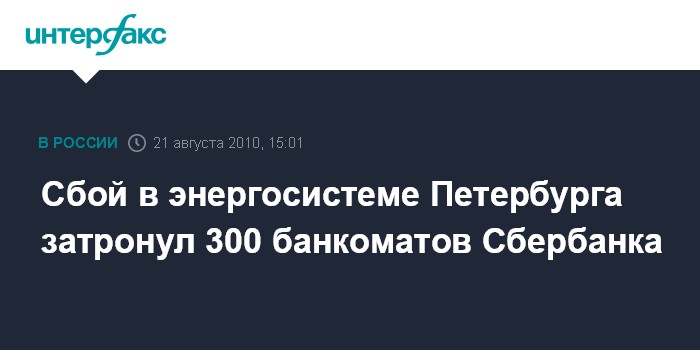 Санкт-Петербург. 21 августа. INTERFAX.RU - Часть банкоматной сети Северо-Западного банка Сбербанка РФ в Петербурге в субботу остается отключенной после сбоя в системе энергоснабжения города. Сбой в энергосистеме, произошедший накануне вечером, затронул 300 банкоматов в Петербурге из 1,8 тыс., часть из них в субботу в первой половине дня оставалась выключенной, сообщили "Интерфаксу" в пресс-службе Сбербанка. "Проблема не является системной, все выключенные банкоматы после отключения электричества необходимо заново запускать. Планируется включить все банкоматы к 15:00 мск", - сказал представитель банка.