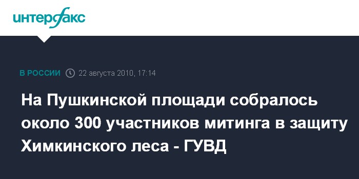 Москва. 22 августа. INTERFAX.RU - По официальным данным ГУВД, на митинг в защиту Химкинского леса, который проходит на Пушкинской площади в центре Москвы, пришло около 300 человек. Такие данные "Интерфаксу" привели в ГУВД российской столицы в воскресенье.