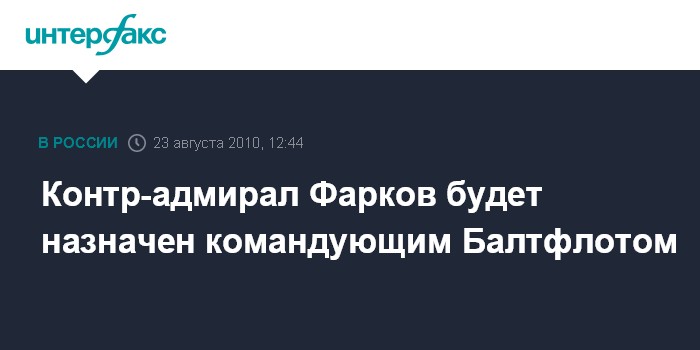 Калининград. 23 августа. INTERFAX.RU - Новым командующим Балтийским флотом России в ближайшее будет назначен контр-адмирал Сергей Фарков, сообщил "Интерфаксу" в понедельник источник в штабе Балтийского флота.