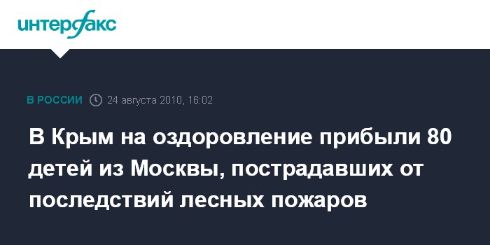 Киев. 24 августа. INTERFAX.RU - Группа детей из Москвы, пострадавших от последствий лесных пожаров, прибыла в Евпаторию (Крым) на оздоровление.