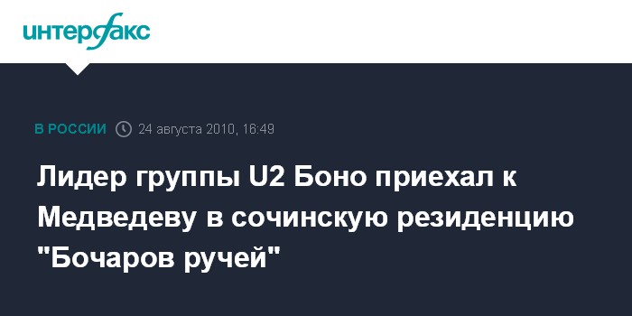 Сочи. 24 августа. INTERFAX.RU - Президент РФ Дмитрий Медведев за чашкой чая встретился во вторник с лидером ирландской группы U2 Боно, концерт которой состоится в Москве 25 августа.