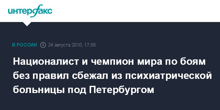 Санкт-Петербург. 25 августа. INTERFAX.RU - Милиция Петербурга разыскивает Вячеслава Дацика - активиста "Славянского союза" и чемпиона мира по боям без правил, сбежавшего из психиатрической больницы.