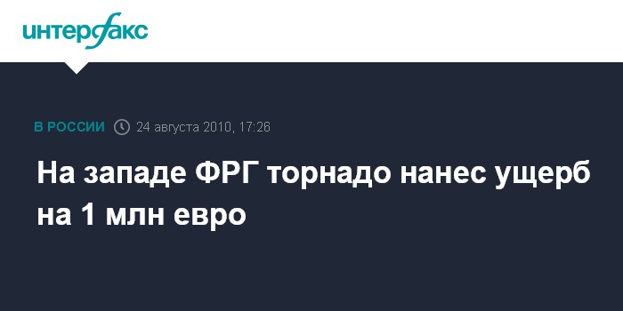 Берлин. 24 августа. INTERFAX.RU - Торнадо, пронесшийся над федеральной землей Гессен на западе ФРГ, нанес ущерб на 1 млн евро, сообщает во вторник веб-сайт немецкой журнала Stern.
