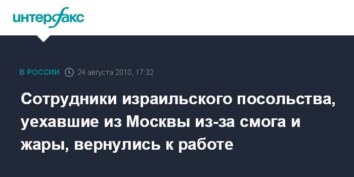 "Сейчас посольство работает в полном составе. Те наши сотрудники, которые покинули Москву из-за неблагоприятной экологической обстановки, вернулись к месту работы", - сообщил во вторник "Интерфаксу" представитель израильской дипмиссии.