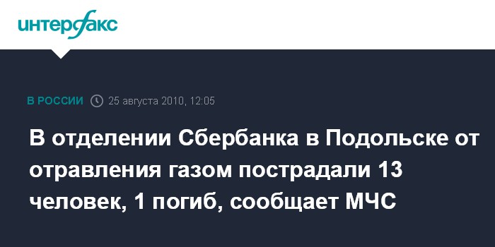 Москва. 25 августа. INTERFAX.RU - В результате разгерметизация газифицированной системы пожаротушения в среду в офисе Сбербанка в подмосковном Подольске в общей сложности пострадали 13 человек и одна женщина погибла, сообщили "Интерфаксу" в пресс-службе главного управления МЧС РФ по Московской области.