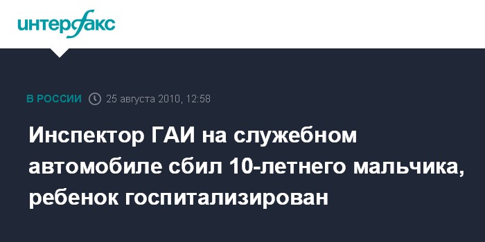 Санкт-Петербург. 25 августа. INTERFAX.RU - В Петербурге на Васильевском острове инспектор ГИБДД во время патрулирования сбил 10-летнего ребенка, сообщили "Интерфаксу" в УГИБДД северной столицы.