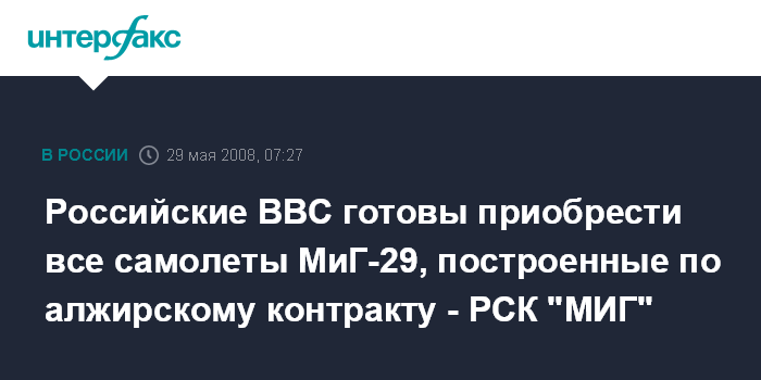 Российские ВВС готовы приобрести все самолеты МиГ-29, построенные по алжирскому контракту - РСК "МИГ"