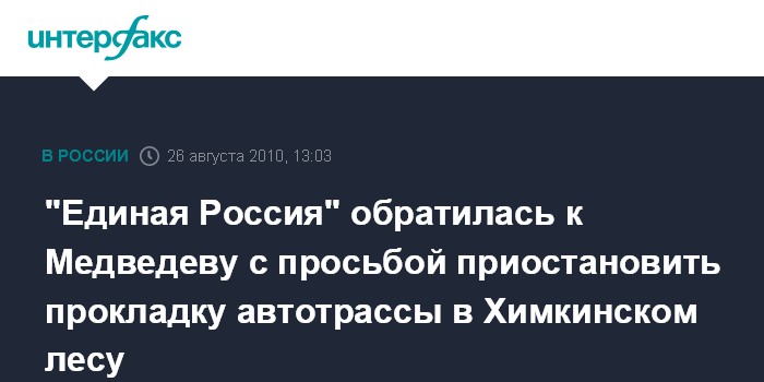 Москва. 26 августа. INTERFAX.RU - "Единая Россия" просит президента РФ Дмитрия Медведева приостановить прокладку автомобильной трассы в Химкинском лесу.
