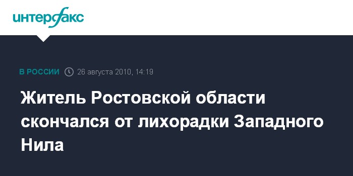 "На сегодняшний день в Ростовской области зарегистрировано 27 случаев заболевания лихорадкой. Один из заболевших, пожилой мужчина, в возрасте старше 70 лет, скончался от возникших в связи с данным заболеванием осложнений", - сообщил агентству "Интерфакс" главный санитарный врач Ростовской области Михаил Соловьев.