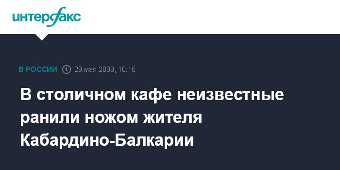 "В среду в милицию поступила информация из больницы, что туда с ножевым ранением в живот и повреждением печени доставлен 21-летний житель Кабардино-Балкарии. Со слов потерпевшего, около полуночи неизвестные напали на него в кафе "Белка", спровоцировали драку и ранили ножом", - рассказал собеседник агентства. Обстоятельства происшествия выясняются, добавил он.