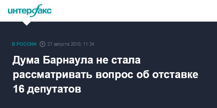 Барнаул. 27 августа. INTERFAX.RU - Вопрос о добровольном сложении полномочий 16 депутатов думы Барнаула, вопреки предварительной информации, не был внесен ни в основную, ни в дополнительную повестку заседания городского парламента в пятницу.