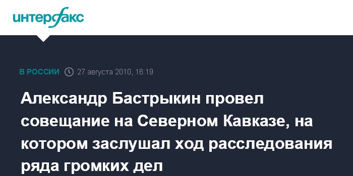 Москва. 27 августа. INTERFAX.RU – Глава СКП РФ Александр Бастрыкин провел оперативное совещание на Северном Кавказе, на котором заслушал ход расследования ряда уголовных дел, сообщили "Интерфаксу" в Следственном комитете при прокуратуре.