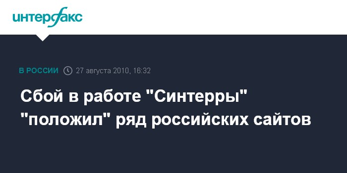 Москва. 27 августа. INTERFAX.RU - Сбой провайдера "Синтерра" привел к временной приостановке работы ряда популярных сайтов Рунета. В частности, в течение почти часа не рабтали сайты ИА "Интерфакс" и сайт "Афиша.ру".