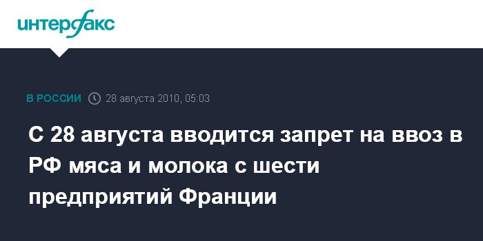 Москва. 28 августа. ИНТЕРФАКС - Россельхознадзор с 28 августа запрещает поставки мяса и молока с шести предприятий Франции.
