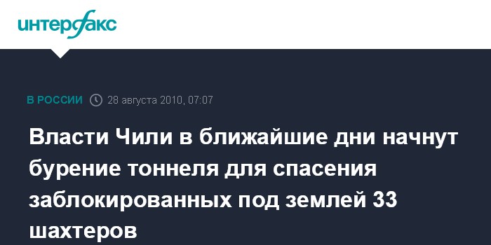 Москва. 28 августа. ИНТЕРФАКС - В ближайшие два-три дня начнется бурение тоннеля для освобождения 33 шахтеров, остающихся под землей третью неделю, сообщает в субботу британская телерадиовещательная корпорация Би-би-си со ссылкой на представителей властей Чили.