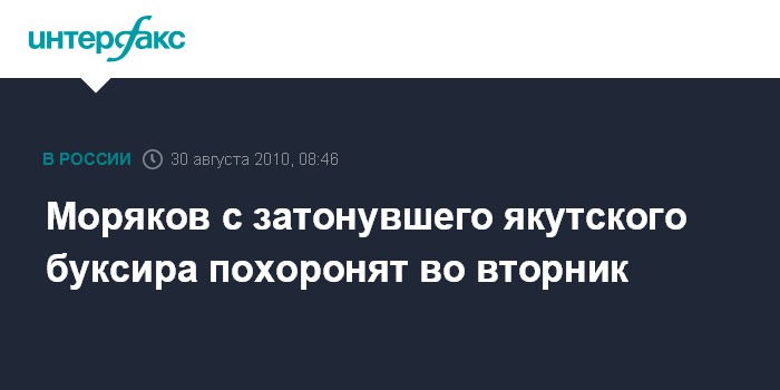 Якутск. 30 августа. INTERFAX.RU - Во вторник в поселке Жатай в пригороде Якутска состоятся похороны трех членов экипажа буксира "Алексей Кулаковский", погибших в минувшую пятницу в кораблекрушении на море Лаптевых