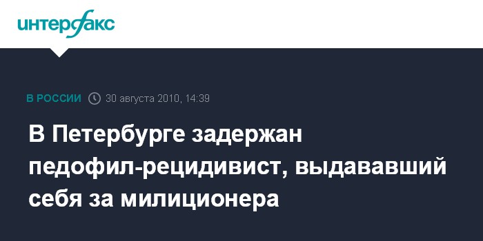 Санкт-Петербург. 30 августа. INTERFAX.RU - Правоохранительные органы Петербурга задержали педофила-рецидивиста, представлявшегося детям сотрудником милиции, сообщил сайт Следственного управления СКП РФ по северной столице в понедельник.