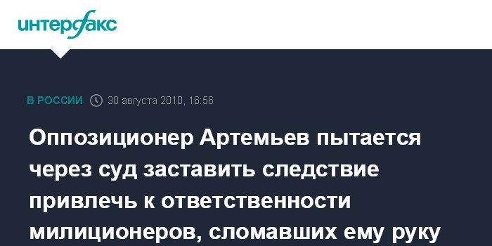 Москва. 30 августа. INTERFAX.RU - Оппозиционный активист и журналист Александр Артемьев, которому сломали руку в отделении милиции после задержания на митинге на Триумфальной площади, пожалуется в суд на бездействие следствия в рамках уголовного дела о причинении ему травмы.