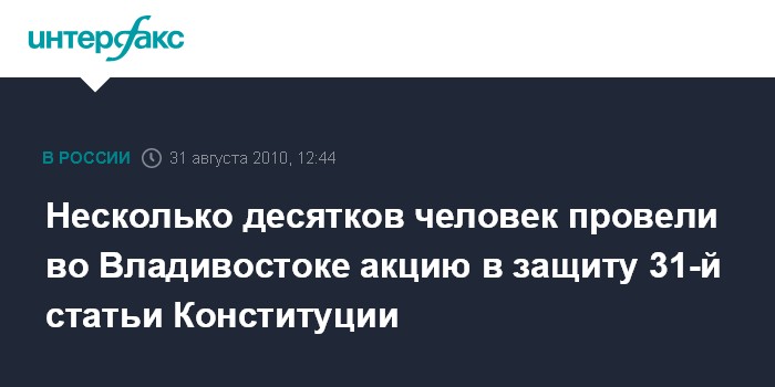 Владивосток. 31 августа. INTERFAX.RU - На центральной площади Владивостока во вторник собрались активисты нескольких партийных и общественных организаций и их сторонники, которые выступали в защиту 31-й статьи Конституции РФ, гарантирующей свободу при проведении публичных акций.