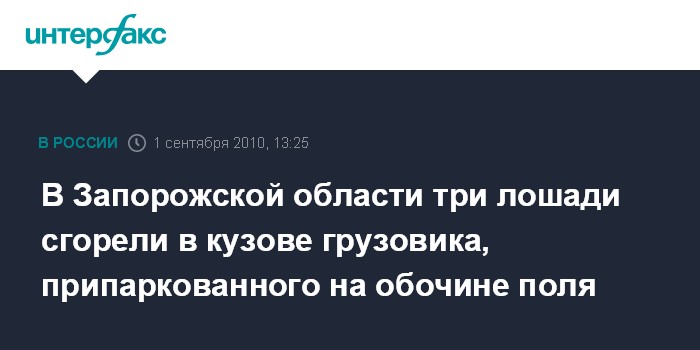 Запорожье. 1 сентября. INTERFAX.RU - В Запорожской области в кузове КамАЗа сгорели три лошади. Пожар возник в Бердянском районе на 593 км автодороги Одесса-Мелитополь-Новоазовск.