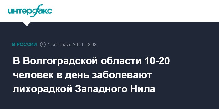 Волгоград. 1 сентября. INTERFAX.RU - В Волгоградской области, по данным на 1 сентября, количество зарегистрированных случаев заболевания лихорадкой Западного Нила (ЛЗН) увеличилось до 206 человек, сообщили агентству "Интерфакс" в региональном управлении Роспотребнадзора.