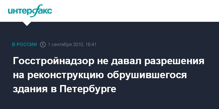 Санкт-Петербург. 1 сентября. INTERFAX.RU - Служба государственного строительного надзора и экспертизы Петербурга не давала разрешения на реконструкцию обрушившегося в среду здания на Лиговском проспекте, сообщили "Интерфаксу" в пресс-службе ведомства.
