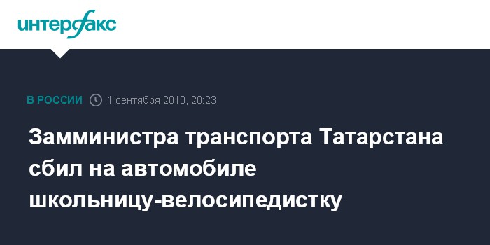 Казань. 1 сентября. INTERFAX.RU - В Татарстане расследуется ДТП, в результате которого под колеса служебного автомобиля под управлением замминистра транспорта и дорожного хозяйства республики Петра Чернова попала 14-летняя Алина Искакова, ехавшая на велосипеде.
