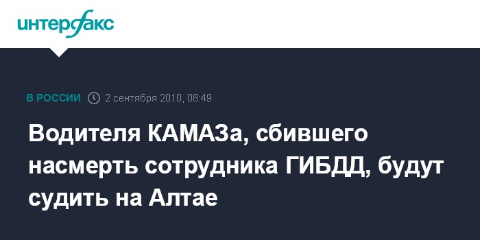 Барнаул. 2 сентября. INTERFAX.RU - В Алтайском крае завершилось расследование уголовного дела по обвинению водителя КАМАЗа, сбившего насмерть сотрудника ГИБДД.
