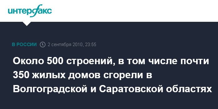 Москва. 2 сентября. ИНТЕРФАКС - В результате пожаров в саратовской и волгоградской областях огнем уничтожены 474 строения, в том числе 342 жилых дома.
