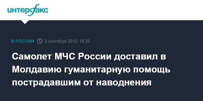 Кишинев. 3 сентября. INTERFAX.RU. - Транспортный самолет ИЛ-76 министерства чрезвычайных ситуаций России доставил в пятницу в Кишинев гуманитарный груз весом 20 т и стоимостью около 29,4 млн. рублей ($1 млн.).