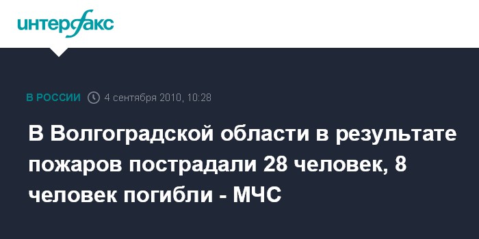 Ростов-на-Дону. 4 сентября. INTERFAX.RU - В результате ландшафтных пожаров в Волгоградской области погибли восемь человек, пострадали 28 человек, сообщили агентству "Интерфакс-Юг" в субботу в Южном региональном центре МЧС РФ. "Девять человек из числа пострадавших госпитализированы, 19 находятся на амбулаторном лечении, погибли восемь человек", - сообщил собеседник агентства.