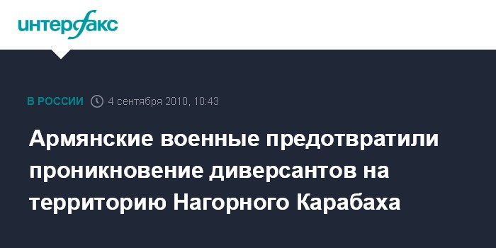 "В результате предпринятых адекватных действий попытка была пресечена, есть жертвы среди азербайджанских диверсантов. Обнаружено оружие, в том числе автомат Калашникова с глушителем, наручники и пр.", - сказал источник. "Интерфакс" пока не располагает информацией об инциденте из азербайджанских источников.