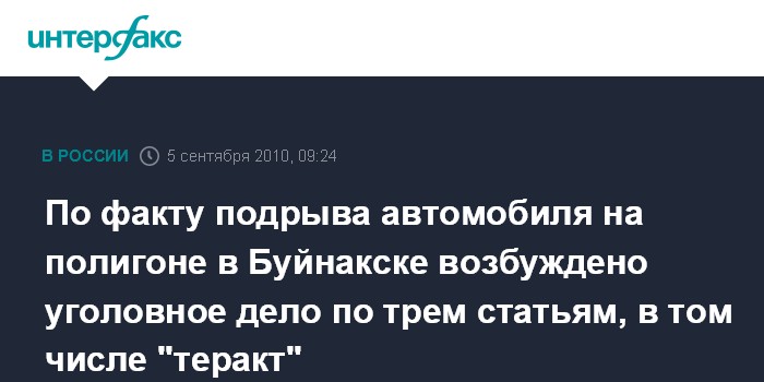 Москва. 5 сентября. ИНТЕРФАКС - Следственные органы Следственного комитета по республике Дагестан возбудили по факту подрыва автомобиля на территории военного полигона в городе Буйнакске уголовное дело.
