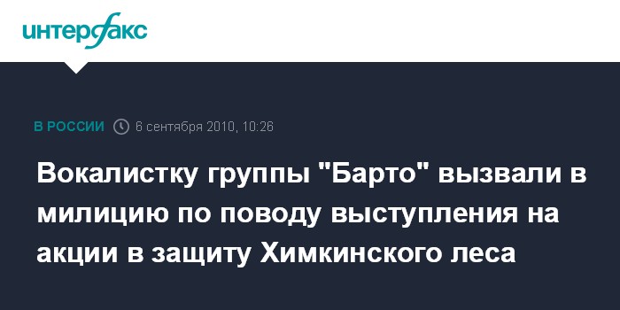 Москва. 6 сентября. INTERFAX.RU – Вокалистка группы "Барто" Мария Любичева написала в своем блоге в "Живом журнале", что получила телефонный звонок с требованием явиться к следователю и написать объяснение по поводу текста песни "Готов", которую группа исполняла на митиге в защиту Химксинского леса на Пушкинской площади в Москве 22 августа.