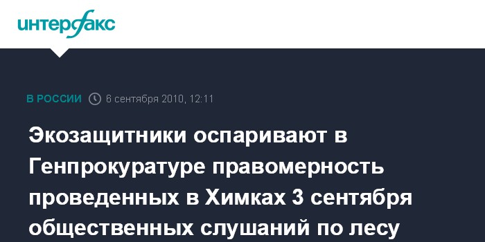 Москва. 6 сентября. INTERFAX.RU - Экозащитники направили заявление в Генпрокуратуру РФ с требованием устранить нарушения закона, допущенные при проведении в Химках дополнительных общественных слушаний.