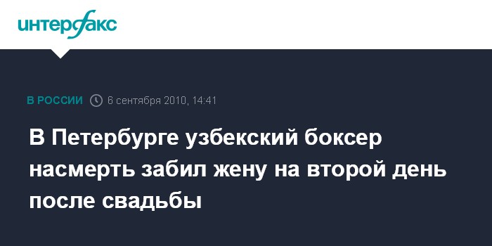 Санкт-Петербург. 6 сентября. INTERFAX.RU - В Петербурге боксер насмерть забил жену через два дня после свадьбы, сообщает сайт Следственного управления СКП по северной столице в понедельник.