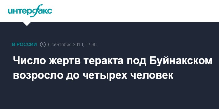 Москва. 6 сентября. INTERFAX.RU - Скончался еще один военнослужащий, пострадавший во время теракта под Буйнакском (Дагестан) в ночь на воскресенье, заявил руководитель военно-следственного отдела войсковой части 68804 подполковник юстиции Альберт Кокоев.