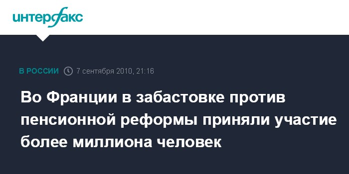 Париж. 7 сентября. INTERFAX.RU - В масштабной общенациональной забастовке во Франции, направленной портив предложенного правительством плана пенсионной реформы, по данным Французской демократической конфедерации труда (ФДКТ), приняли участие 2,5 млн человек.