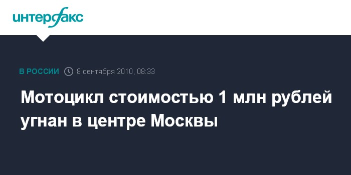 Москва. 8 сентября. INTERFAX.RU - В центре Москвы во вторник утром у учредителя аудиторского агентства был угнан мотоцикл "BRP САN - FV roadster spider", сообщил "Интерфаксу" в среду источник в правоохранительных органах города.